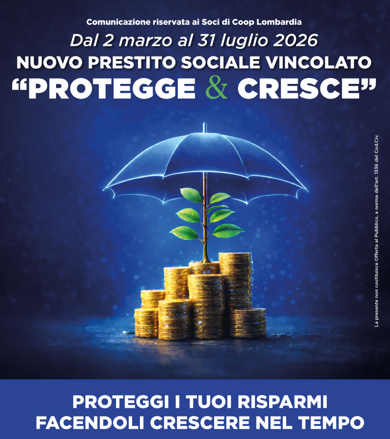Dal 2 marzo al 31 luglio2026 puoi sottoscrivere la nuova offerta di Prestito Sociale Vincolato "Protegge & Cresce" che ti permette di proteggere i tuoi risparmi facendoli crescere nel tempo.